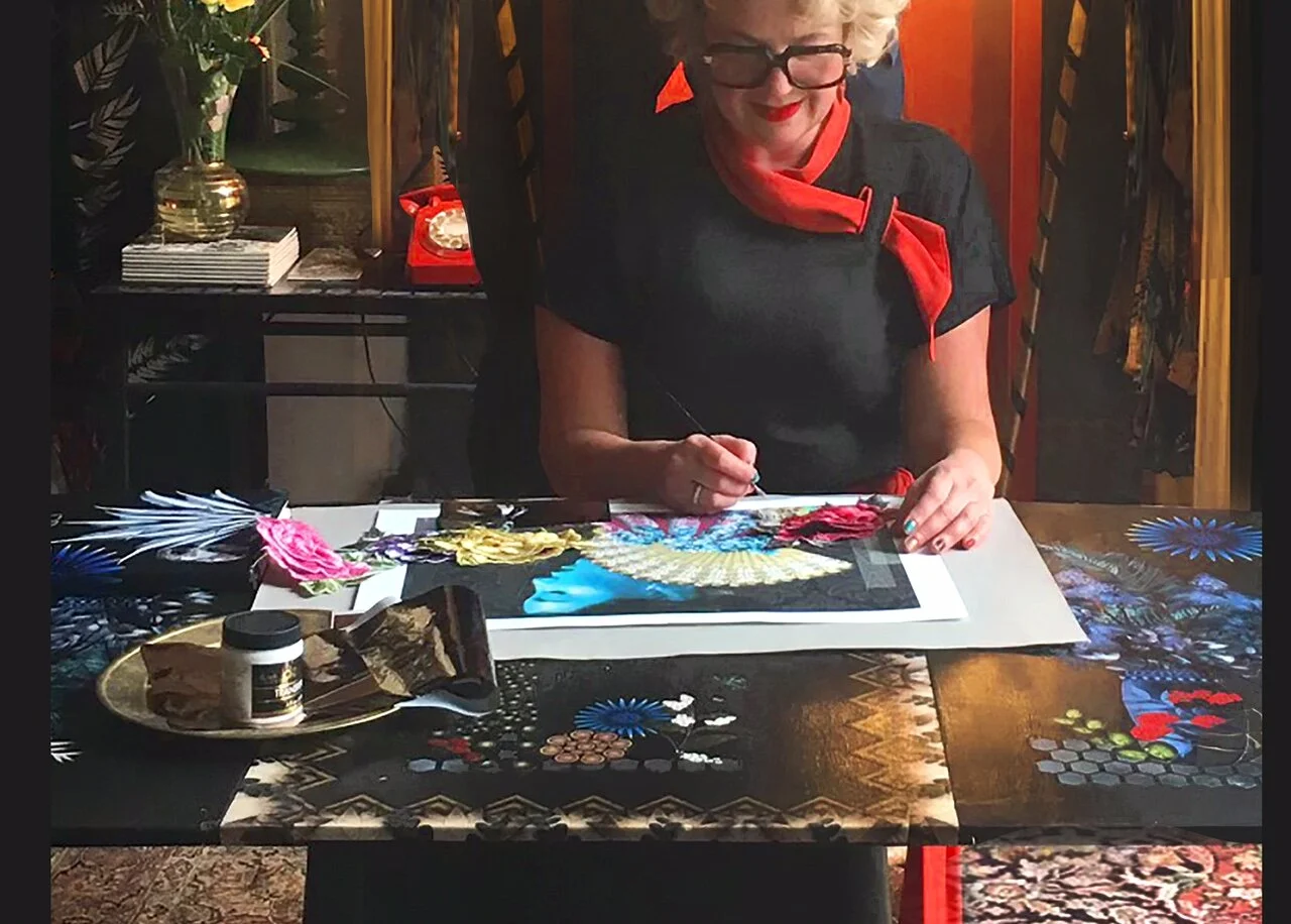 These digital drawings are then combined with hand-painted backgrounds and self-taken photographs, which create that surreal mix of the actual and the imagined that Sarah is known for. Each work is a collage of endless ingredients, painstakingly composed onto a range of tactile surfaces including paper, textiles, lacquered wood and concrete. Finally, Sarah breathes dazzling life into her work with hand-cut sections of gold leaf, antique sequins, vintage beads, and crystals to create luxury texture and finish.